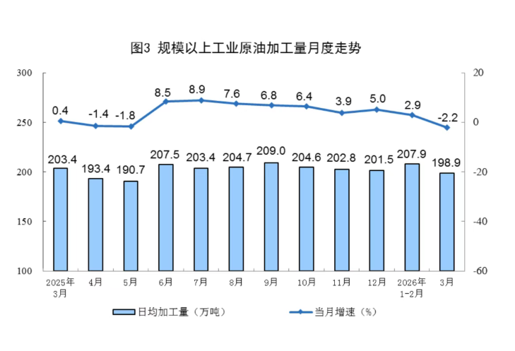 原油加工由增轉降。3月份,規上工業原油加工量6167萬噸,同比下降2.2%;日均加工198.9萬噸。
