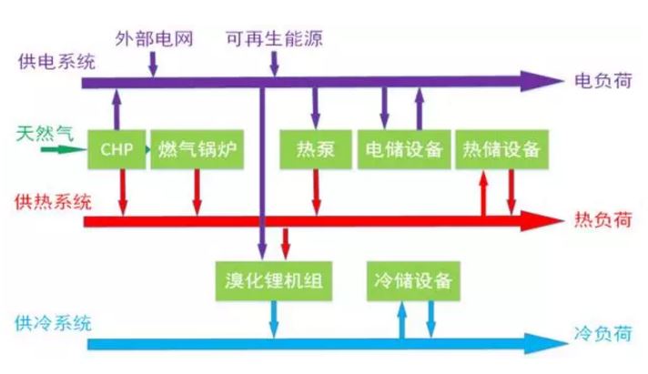 橫向來看依次是源網荷儲。源側包括常規的供電設備、CHP機組、燃氣鍋爐等設備,以及外部電網供電、可再生能源接入;網架分為冷熱電等傳輸系統;荷側為園區內部的電、熱、冷負荷;在儲能方面,不同能源子系統均有各自的儲能設備??v向來看依次是電、氣、熱、冷多能互補運行。不同的能源子系統分別用不同的顏色表示,多種能源轉化設備(熱泵、CHP、燃氣鍋爐、溴化鋰機組)將不同的能源子系統相耦合。園區內部多種能源形式以虛擬電廠的形式組合在一起綜合運行,在保證電、熱、冷負荷可靠供應的前提下,實現了能源的梯級利用,提高能效,降低用能成本。并且對于波動性很強的可再生能源而言,綜合能源系統具有更多的靈活性,促進了可再生能源的接納,進一步提高系統經濟性。